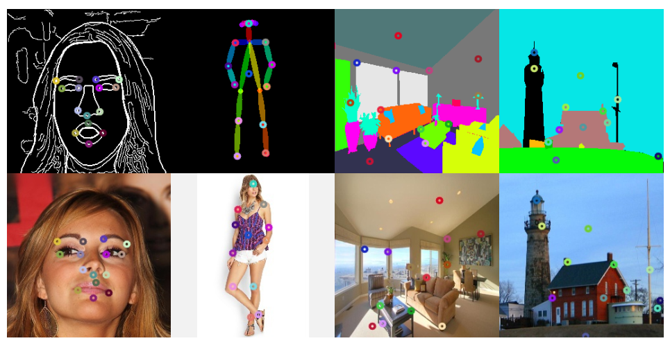图2:CoCosNet 生成图。我们在三个任务上进行了实验,在语义分割蒙版->场景图像(1-2行)、轮廓->人脸图片(3-4行)、骨骼关键点->姿态图片(5-6行),均取得了迄今为止最高的生成质量。