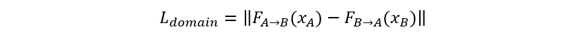 整个网络由两个子网络构成。第一部分为跨域对应(cross-domain correspondence)子网络,其用于找到输入 x_A 与范例 y_B 之间的密集对应。然而,与一般的语义对应方法(如 SFNet [2])不同的是,这两种输入来自于不同的域——如图3中 x_A 是语义分割,y_B 是一张自然室内场景,而我们无法用预先训练的分类特征提取器(如 pretrained VGG/ResNet)来提取两种输入的特征。于是,我们想到利用训练集中 x_A 和它在目标域的配对 x_B,来训练两个域的特征提取器 (F_(A→B) 和 F_(B→A)),使得他们提取到的特征可以适应到一个对齐的隐空间,我们定义域自适应损失函数为: