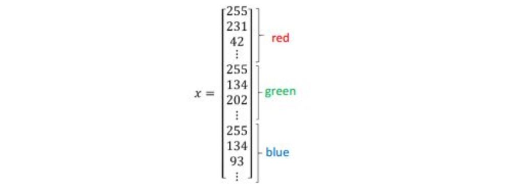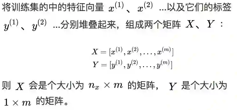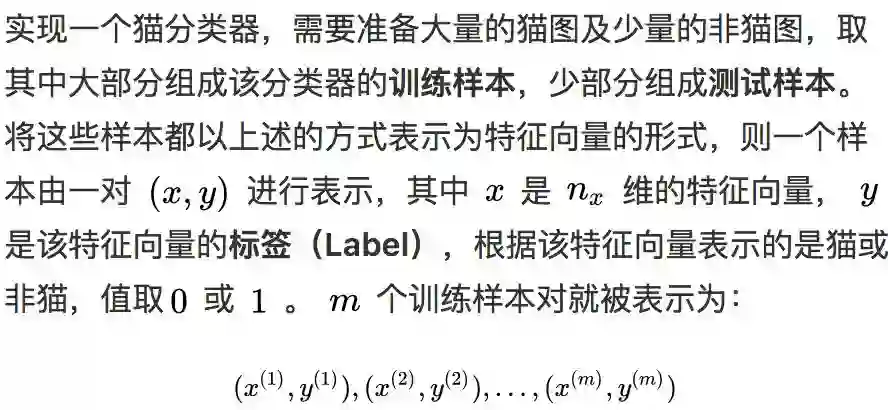 模式识别(Pattern Recognition)以及机器学习中,处理的各种类型的数据都需要用一些特征向量来表示。为了将上例中的图片表示为一个特征向量 x,将每三个信道中三种颜色的值进行拆分重塑,形成维数为 nx = 64*64*3=12288的特征向量: