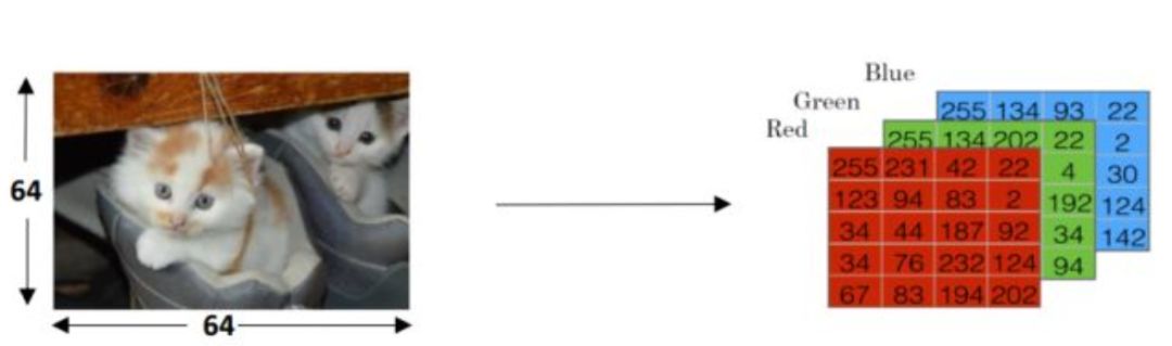 图片是一类非结构化的数据。在计算机中,一张图片以RGB编码方式存储时,是将它以红、绿、蓝为三基色,以每个像素点上三种颜色的十六进制颜色码进行编码,形成一个包含三个信道(Channel),各信道大小和图片的大小相同的矩阵。例如图中的猫图大小为 64*64,那么表示为矩阵后的每个信道大小即为 64*64