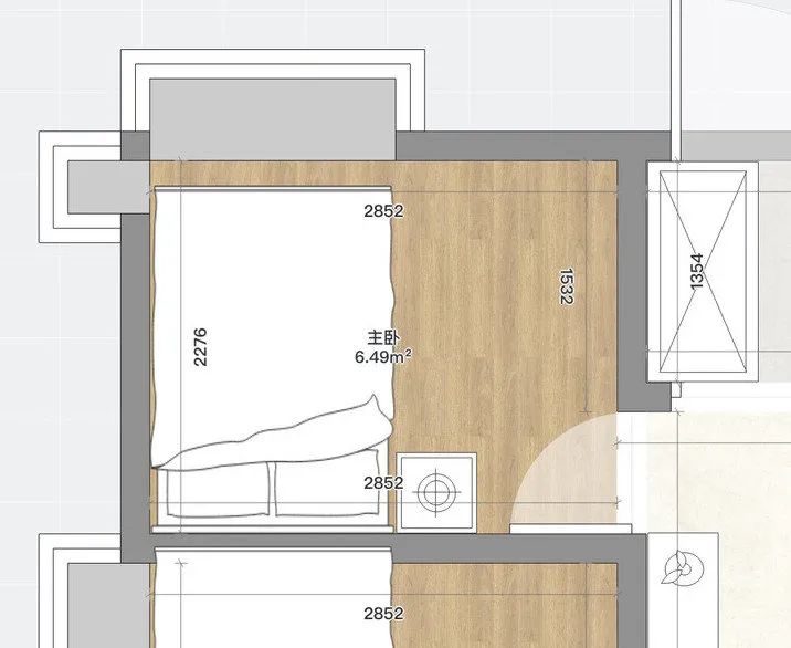 但是千万不能忽略的一个问题是,门开关时划出来的扇形区域,其实也不能算作可用空间。而有趣就有趣在,房间门的位置稍微外移了一些,让渡了一部分空间。
