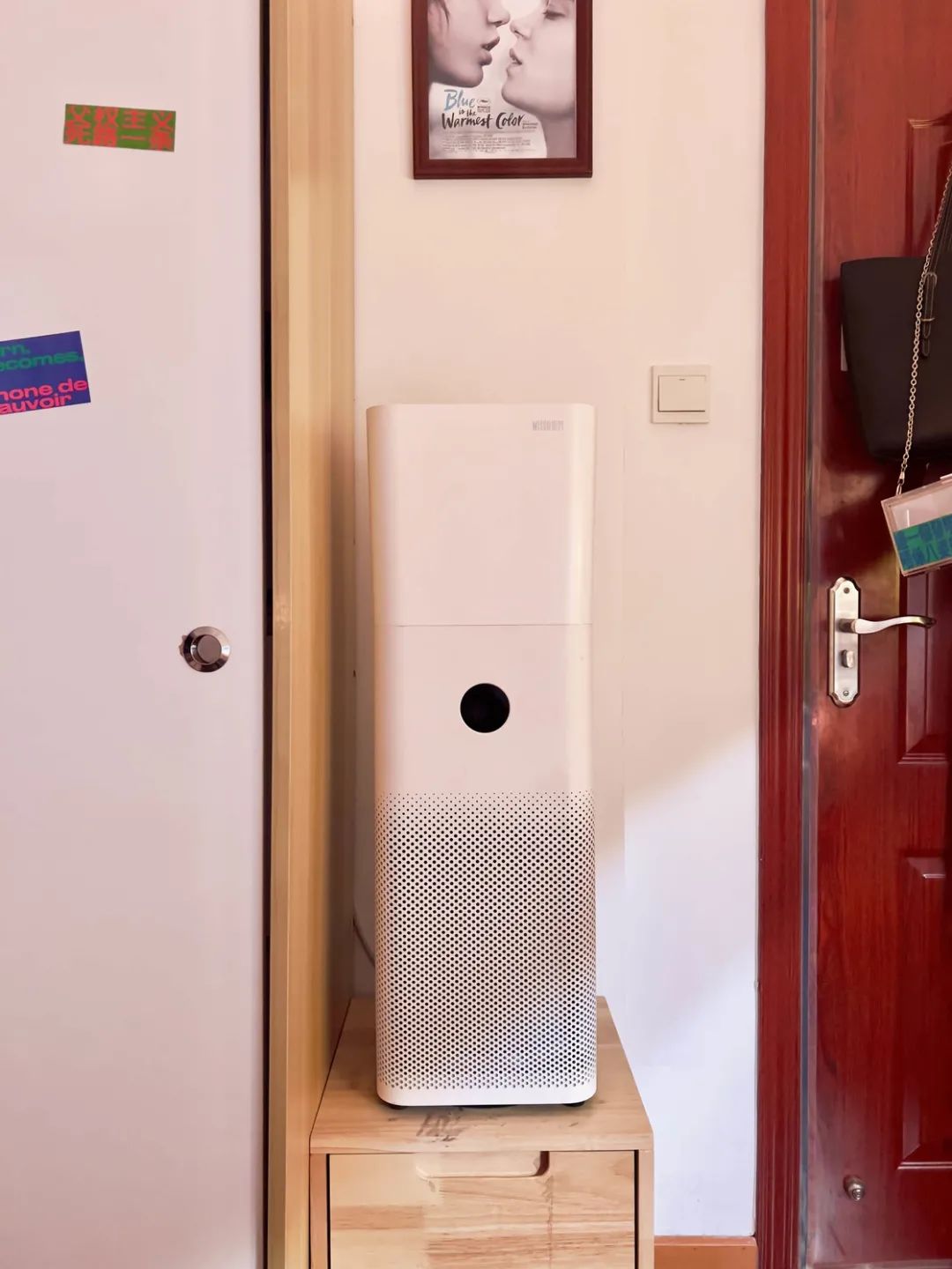 同样的,借助叠放的思路,我们也可以在已有的平面中进行「套娃」。比如我将空气净化器放在了衣柜旁边的小边桌上,这样不仅拥有了三层的储物空间,上面的一片地方也没有浪费。