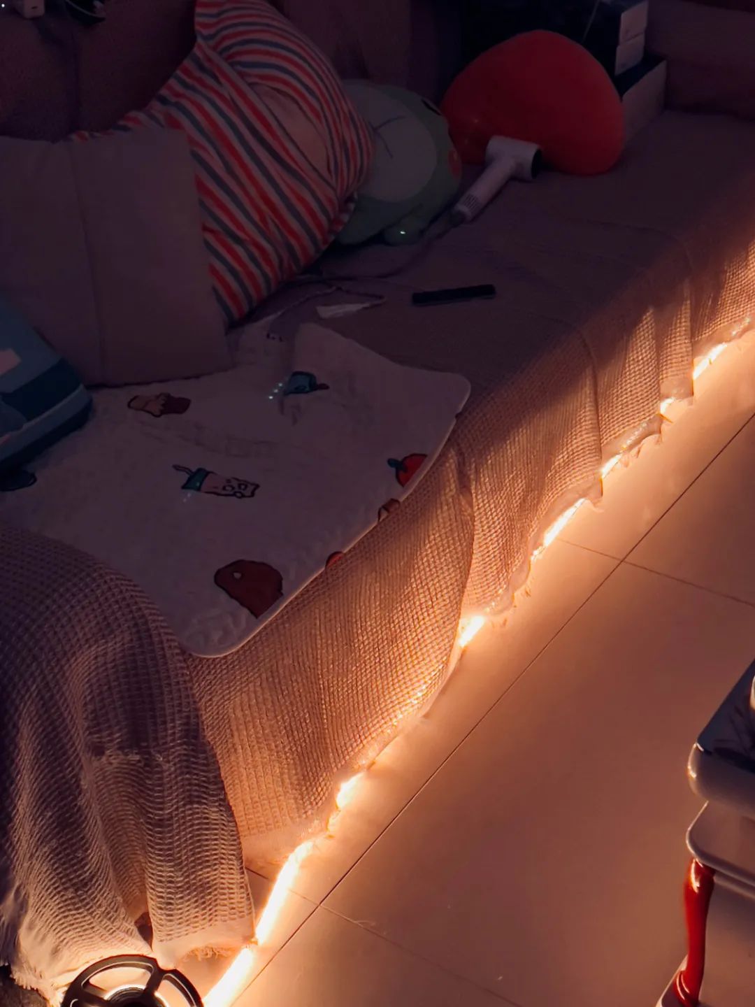 其次,你可以在一些不方便布置灯带的地方加上一些氛围灯照明,例如斗柜上平面和床头柜上。这些光源的约在房间高度的中央区域,可以跟地面和柜顶的光源形成很好的互补,照亮这些灯带无暇顾及的区域。