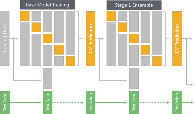 5. Stage 1 模型集成训练 II(如图5第二和三行右半部分所示)。将步骤 2 中得到的 CV Prediction 当作新的训练集和步骤 3 中得到的 Prediction 当作新的测试集,按照步骤 3 可以得到 Stage 1 模型集成的测试集 Prediction。此为 Stage 1 的输出,可以提交至 Kaggle 验证其效果。
