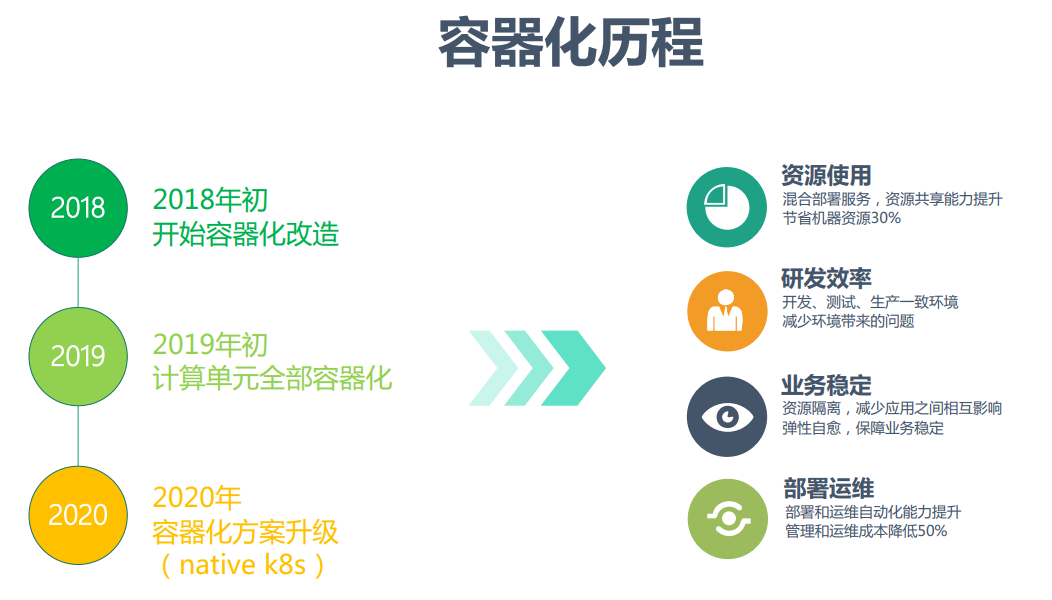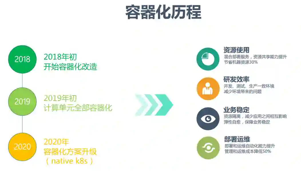 京东从2018年开始进行计算引擎的容器化改造,2019年初已经实现计算单元全部容器化,2020年进行了容器化方案升级,使用native k8s实现计算资源的弹性扩容。容器化改造的好处是提升了资源使用率,提高了研发效率,增强了业务稳定性,减少了运维部署成本。