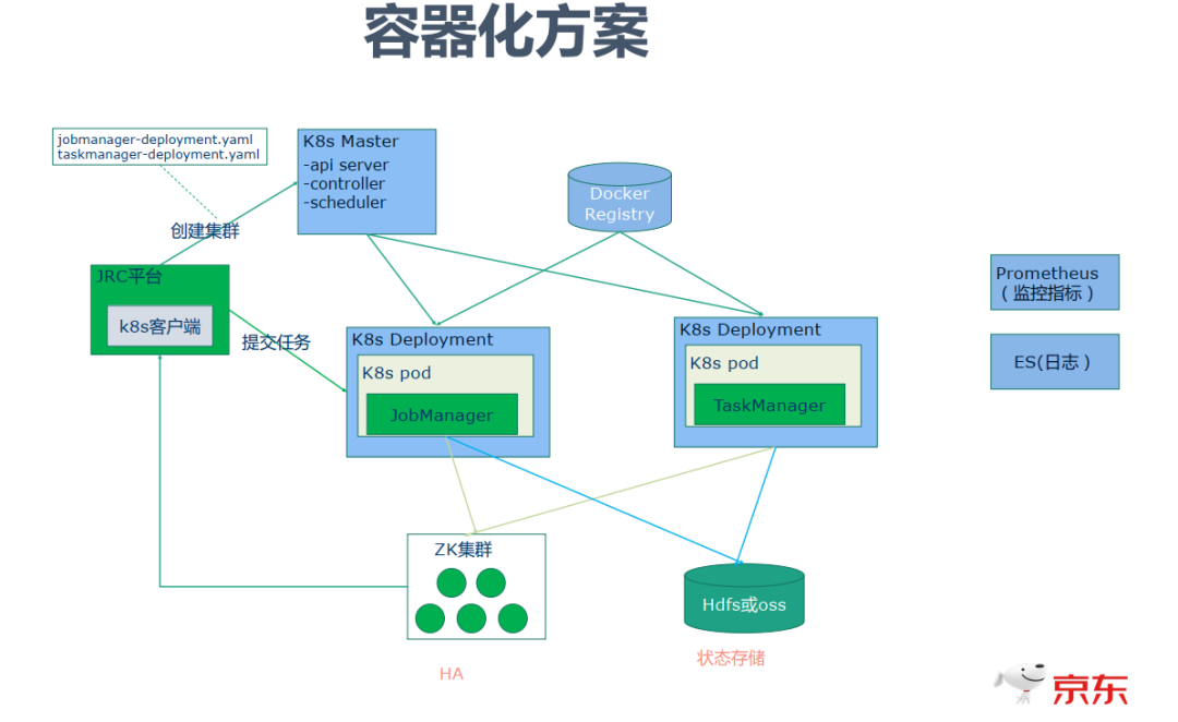旧的容器化方案是基于k8s Deployment部署的Standalone Session集群,它需要事先预估出集群所需资源,比如需要的JobManager和TaskManager的资源规格和个数。然后JRC平台通过K8S客户端向K8S Master提出请求,创建JobManager的Deployment和TaskManager的Deployment。其中使用ZK保证高可用,使用Hdfs实现状态存储,使用Prometheus实现监控指标的上传,结合Grafana实现指标的直观展示。集群使用ES存储日志,方便日志的查询。