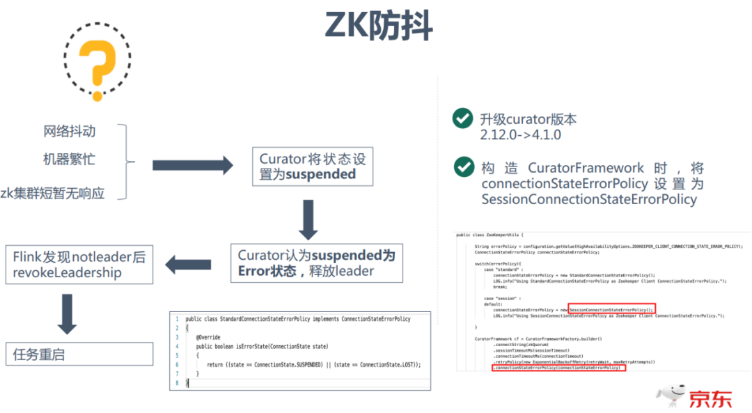 任务重启的原因是由于在这些场景发生时,Curator会将状态设置为suspended,并且Curator认为suspended为Error状态,从而会释放leader,Flink发现notleader后会revokeLeadership,从而造成任务重启。