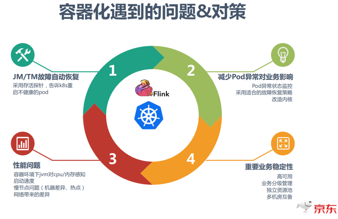 在k8s中由于硬件异常、资源过载、Pod不健康等问题会导致Pod被驱逐或自动重启,Pod重启时势必会影响到该Pod上分布计算任务的正常运行。这个时候可以考虑采用适当的重启策略、改造内核等方案来减少对任务影响。比如京东实现了JM Failover优化,当Pod异常引起JM Failover时采用的是任务不恢复、重建任务状态恢复的方式,可以一定程度上减少Pod重启对业务带来的影响。