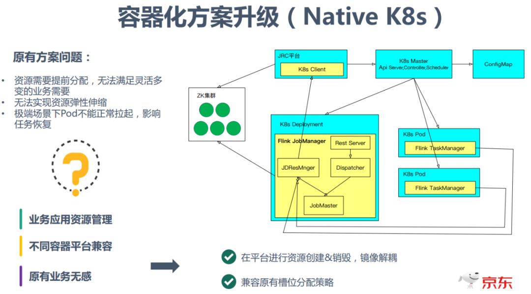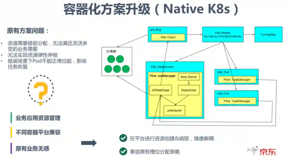 容器化升级的解决方案是采用Native K8s的方式。由JRC平台先向K8S Master发出请求,创建JobManager的Deployment;然后在用户通过Rest服务提交任务后,由JobMaster通过JDResourceManager 向JRC平台发出请求,然后JRC平台向 K8s Master 动态申请资源去创建运行TaskManager 的Pod。