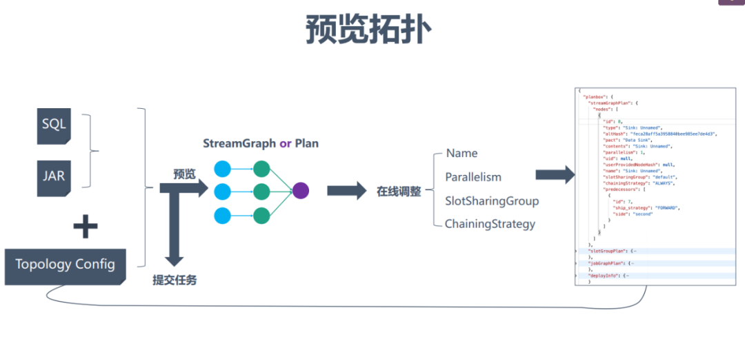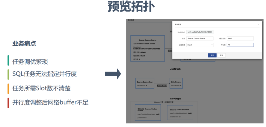 预览拓扑主要是为了解决业务的一些痛点:比如任务调优繁琐、SQL任务无法指定并行度、任务需要的额Slot数不清楚、并行度调整后网络buffer不足等。在Flink任务调试阶段,对任务并行度、Slot分组、Chaining策略的调整是个反复的过程,如果把参数写到命令行就太繁琐了。而基于预览拓扑就可以很方便地对这些参数进行配置。