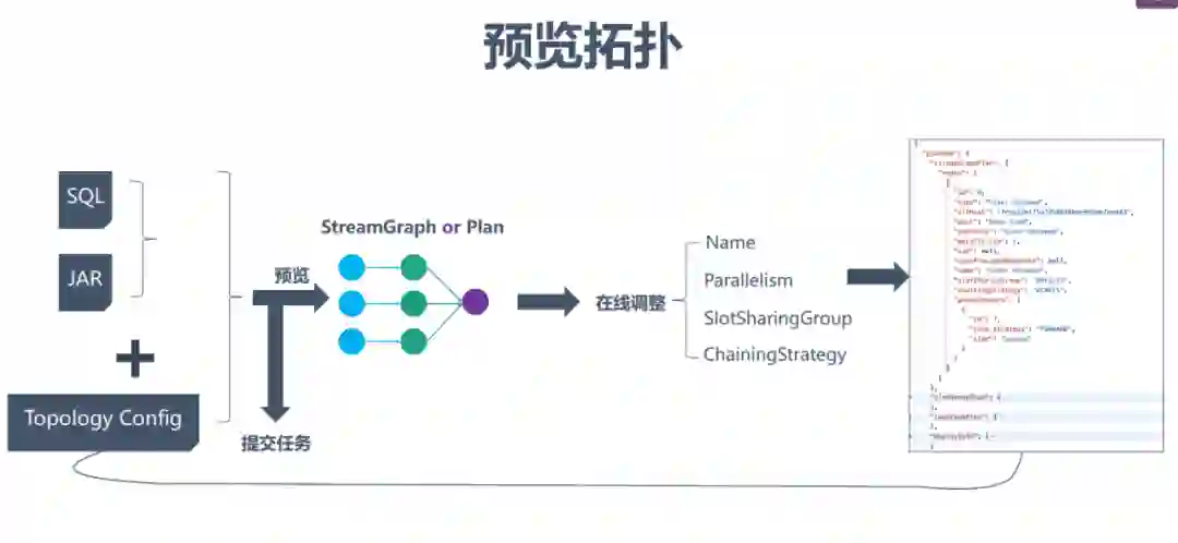预览拓扑基本的实现方案如上图:用户提交JAR包后可根据JAR包生成对应的拓扑图,之后用户根据拓扑图可以进行在线调整,最后自动将修改后的配置和原来的JAR包一起进行任务提交。