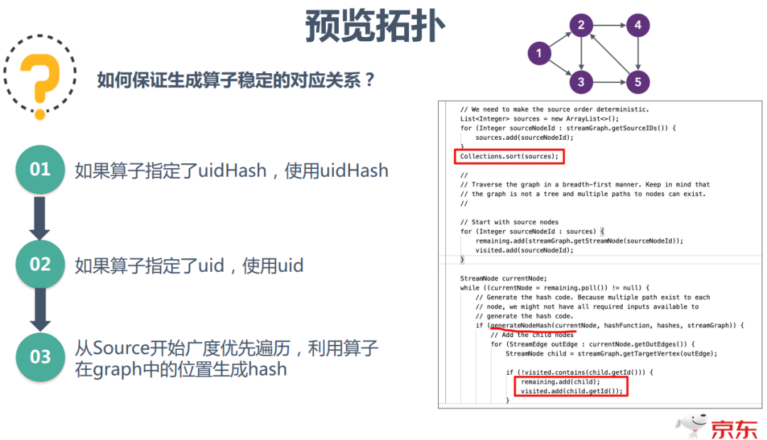 预览拓扑机制使得不修改程序多次提交任务调优成为可能,但是如何保证前后两次提交生成算子稳定的对应关系呢?解决方案的关键是保证算子有稳定的唯一身份标识,具体算法是:如果算子指定了uidHash就用uidHash,如果算子指定了uid就使用uid,否则就从source开始广度优先遍历,利用算子在graph中的位置生成一个稳定hash值。