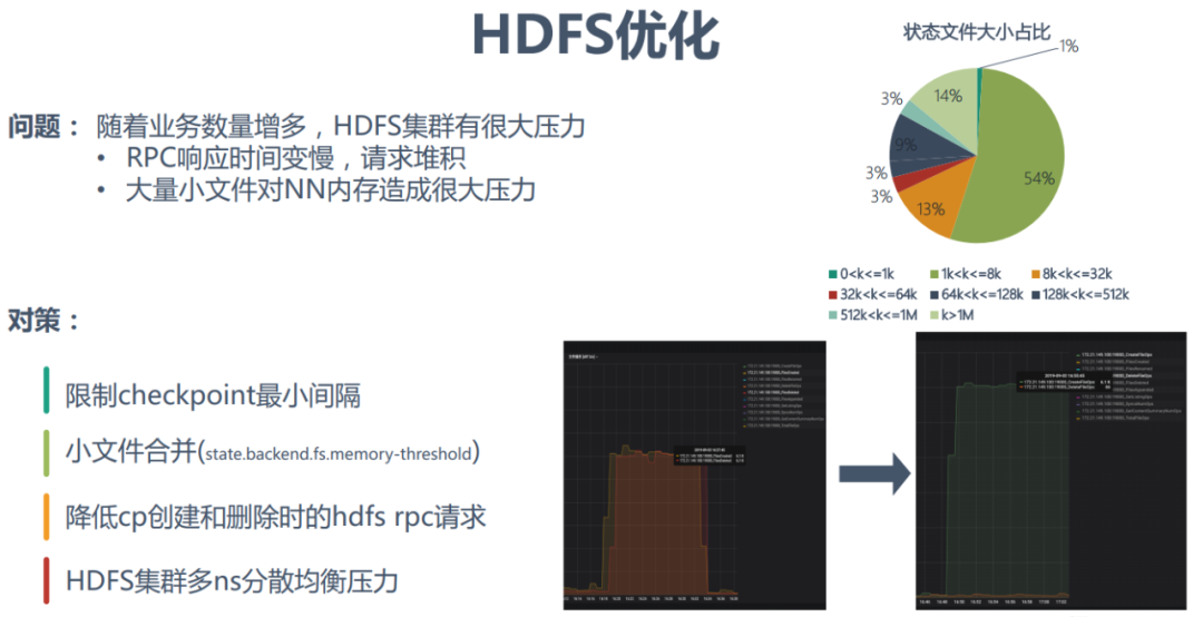 随着业务数量的增多,HDFS集群的压力就会变得很大。这会直接导致RPC响应时间变慢,造成请求堆积,同时大量小文件也会对NN内存造成很大压力。对此京东尝试的解决方案有4方面:限制checkpoint最小间隔,时间最小设置在1min左右可以满足大部分业务需求;进行小文件合并;降低cp创建和删除时的hdfs rpc请求;HDFS集群多ns分散均衡压力。