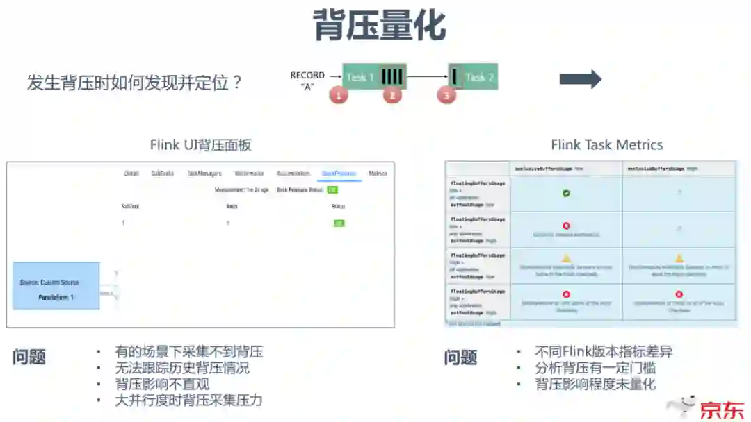 ②通过任务背压相关指标进行观察和分析,通过将指标定期采集并存储起来,可以进行实时或历史的背压分析。但是它也有一些不足的地方: