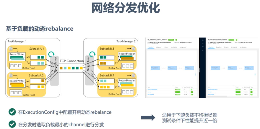 在实践过程中我们发现,即使业务使用了rebalance并且对任务进行了打散分布,但是由于机器处理能力和负载的差异,会导致任务各个并行度不同程序的背压表现,严重影响了任务的性能。为此,我们开发了基于负载的动态rebalance,在数据进行分发时优先选择下游负载最小的channel进行分发。