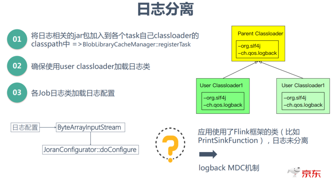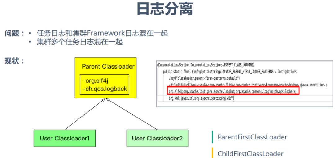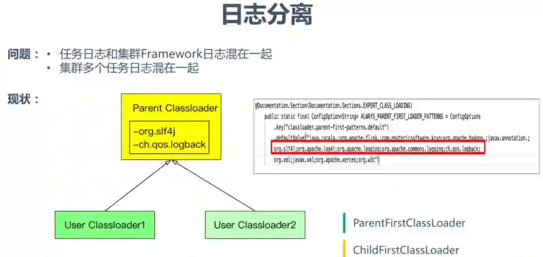 日志分离的解决方案是:将日志相关jar包加入到各个task自己classloader(user classloader)的类路径中;同时确保使用user classloader加载日志类和加载自己的日志配置;