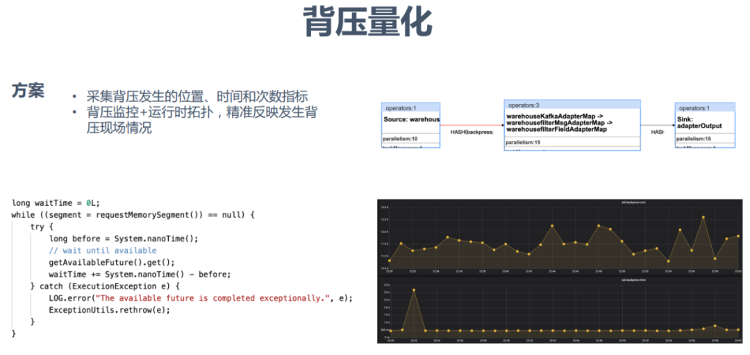 京东的解决方案是采集背压发生的位置、时间和次数指标,并对这些指标进行上报存储。同时对量化的背压指标结合运行时拓扑,可以精确反映发生背压现场的情况。
