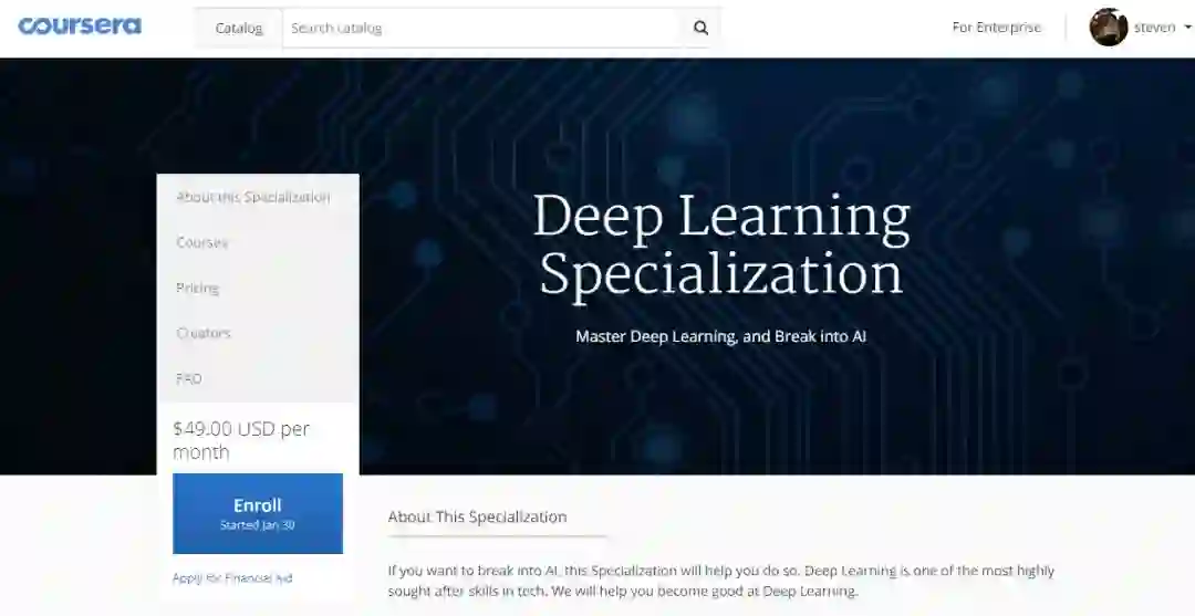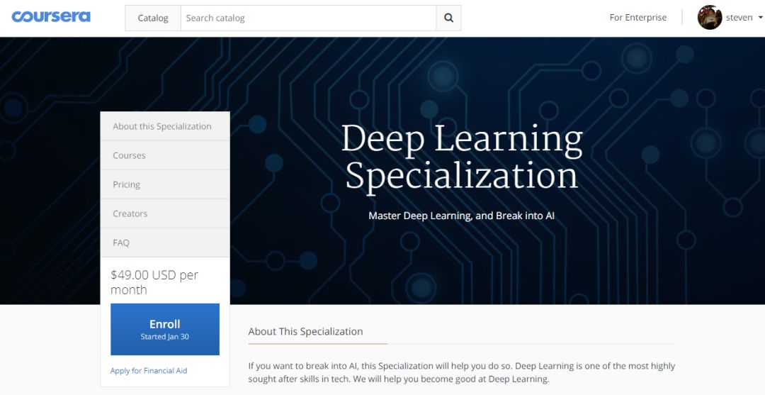 首先注册一个 Coursera 的账号,搜索 Deep Learning Specialization 会显示出下面网页。
