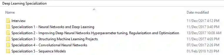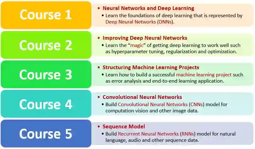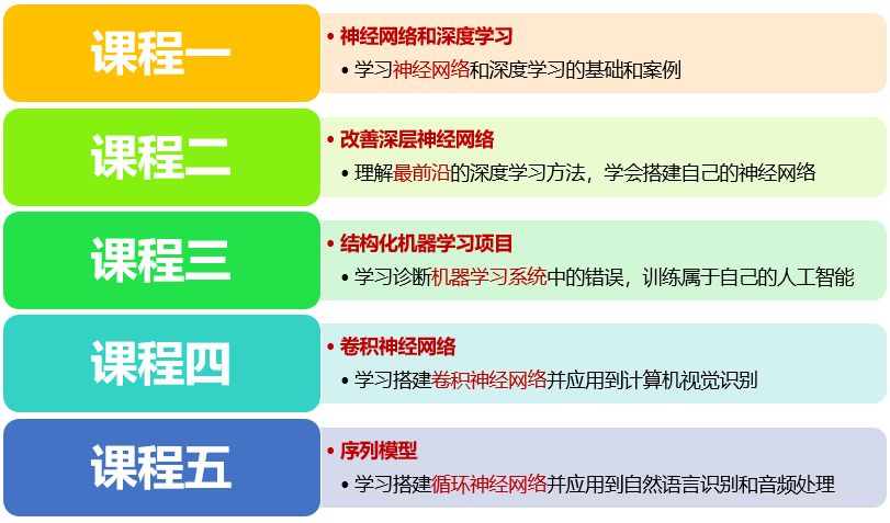 2017 年 8 月初,吴恩达 (Andrew Ng) 在 Coursera 上推出的“深度学习专项“引起了一波人工智能学习热潮,该专项包含五节课,中英文版的课程概要如下: