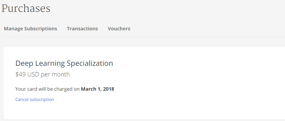 我登记时该专项只出了四门课,我拼命在 7 天内刷完前三门课并及时取消信用卡付费,免费拿了三个证书,第四门实在来不及学了。机智如我,但心里憔悴。有了证书才有动力去刷!