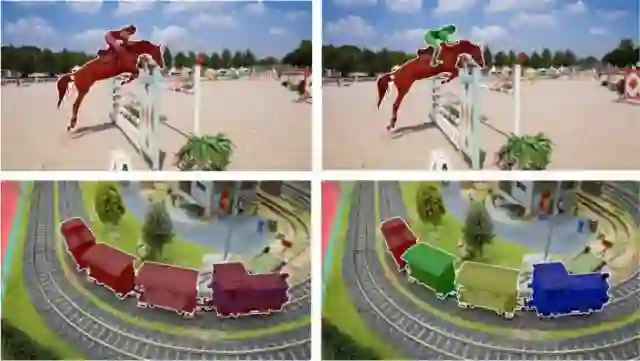 DAVIS-2016 (左) 和 DAVIS-2017 (右) 标注的主要区别:多物体分割(multi-instance segmentation)