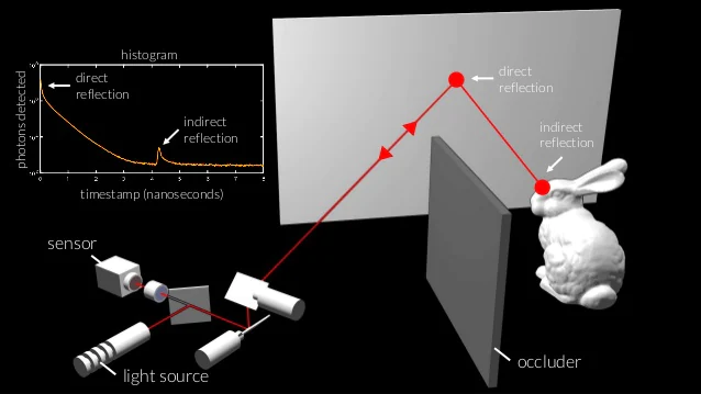 这种被称为合成波长全息术(synthetic wavelength holography)的新方法是通过将相干光间接散射到隐藏的物体上,然后光在这些物体再次散射并传播回相机。