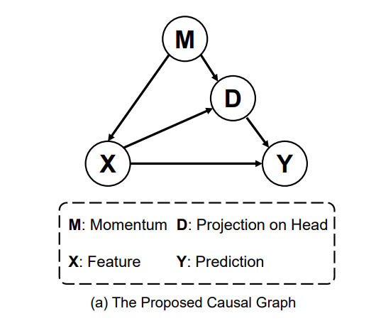 下面就是具体我怎么得出上述的算法。首先,基于我的分析,我们构建了如下的因果图。其中M就是优化器的动量,X是backbone提取的特征,Y是预测。D是特征对头部大类的偏移量。至于为什么会有这个偏移量呢?因为优化器的动量包含了数据集的分布信息,他的动态平均会显著地将优化方向倾向于多数类,这也就造成了模型中的参数会有生成头部类特征的倾向。