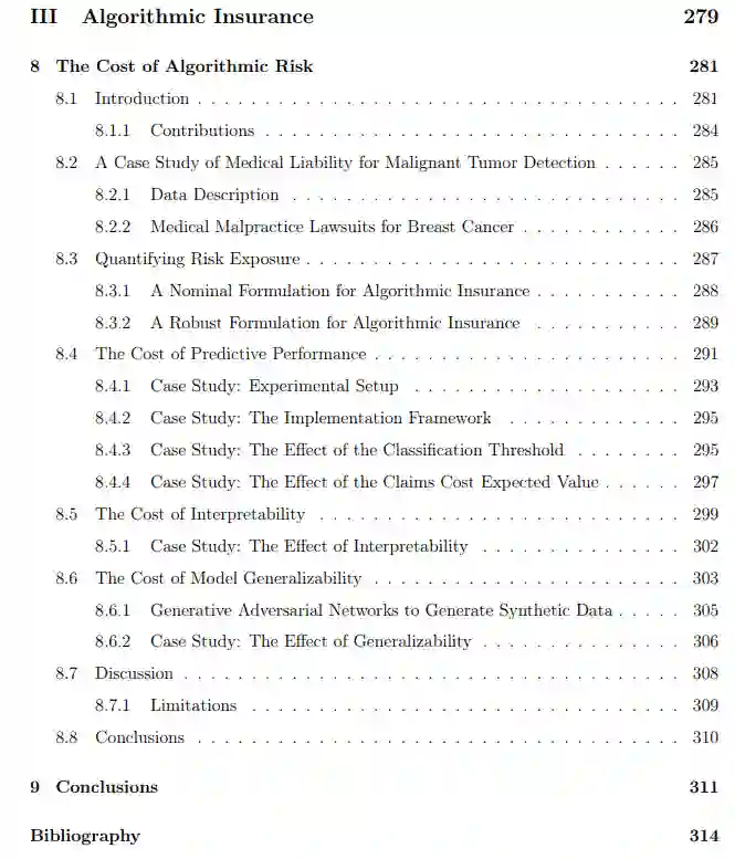 现代医疗保健组织中数据驱动工具的实施同时扰乱了保险业。通过提供强大的预测模型来估计可能导致索赔的不良事件(即心脏病发作、癌症等)的概率,分析已经开始超越健康保险中的传统精算方法。未来,机器学习算法有望发挥更核心的作用,因为在预测性和规范性性能产生更好结果的情况下,它们将被要求取代人类决策。这种转变引发了具有挑战性的问题:“如果算法的推荐错误,谁来承担责任?”和“我们如何保护决策者免受错误的算法预测?”随着人工智能开始融入组织的决策过程,必须开发新型保险产品来保护其所有者免受风险。潜在的例子包括应用于放射学的图像识别系统,这些系统可能承担医疗责任,并从医疗保健扩展到自动驾驶汽车或用于制造的预测性维护算法,以及许多其他应用。第三部分为称为算法保险的新研究领域奠定了基础。我们提出了一个全面的量化过程来估计算法责任保险合同的风险敞口,同时考虑到二元分类模型的预测性能、可解释性和可概括性。我们在医疗事故的背景下展示了我们的方法实施。