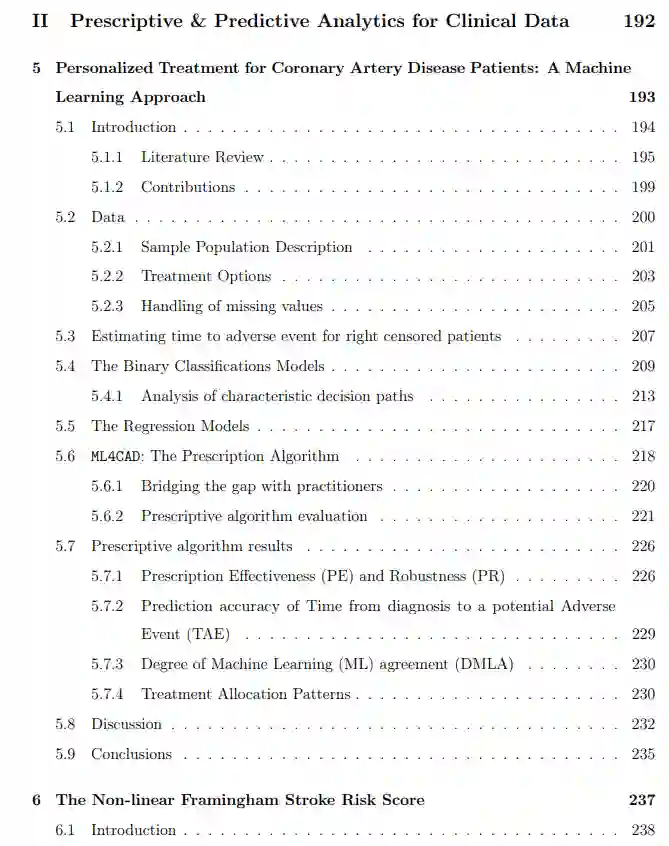 第二部分说明了分析对医疗保健行业的变革力量,强调了我们与医学研究人员在创建促进临床决策的规范模型和预测分数方面的联合研究工作。首先,我们展示了如何利用可用的 ML 算法在患者层面提供治疗建议,从而实现向个性化医疗的过渡。我们的工作通过综合大量患者对不同方案观察到的异质反应,揭示了个性化、高效的治疗方法。我们的规范算法利用了基于投票方案的通用监督学习模型的组合。它的性能是通过一系列新的评估指标来衡量的,这些指标考虑了在各种基本事实下多种治疗的反事实结果。因此,我们评估了规范方法的准确性、有效性和鲁棒性。我们将这项技术应用于冠状动脉疾病 (CAD) 的管理,这是对人类健康影响最大的临床疾病之一(第 5 章)。
