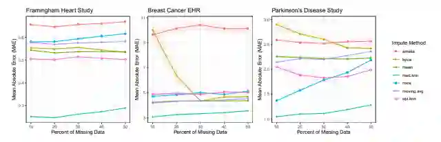 图 2.1:在 FHS、DFCI 和 PPMI 数据集上使用 MAE 度量的每种方法的插补误差,缺失数据的百分比从 10% 变化到 50%。缺失数据机制固定为 MCAR。