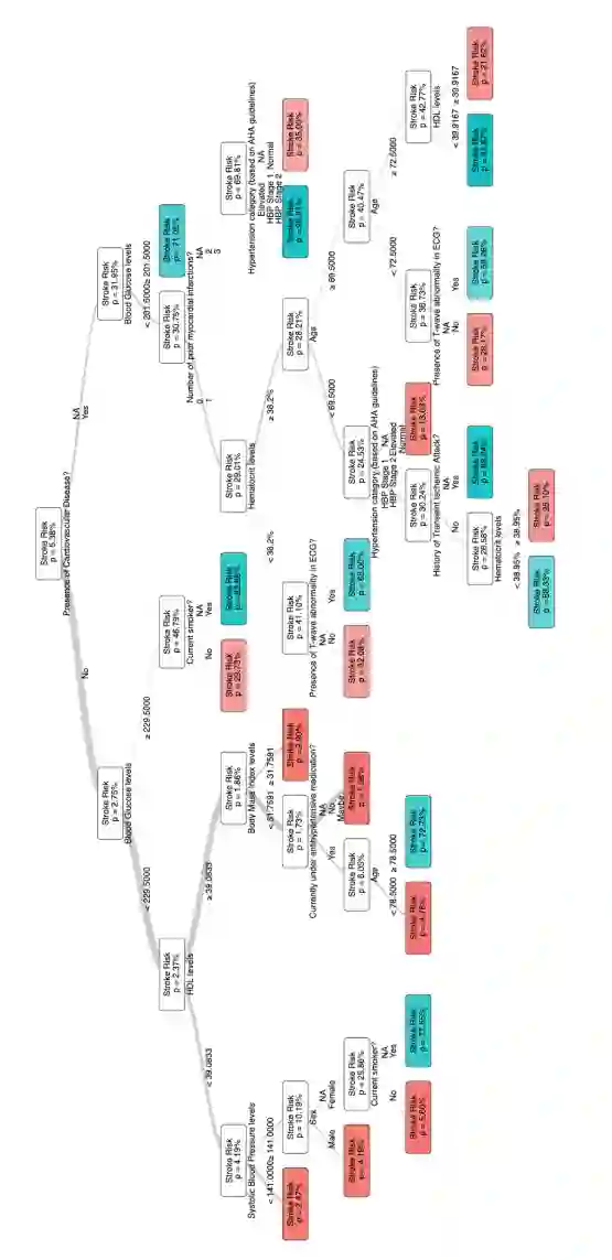 ∙ 我们展示了 N-SRS 树结构如何导致识别 23 个中风风险概况,突出新变量在疾病进展中的作用,例如心电图结果中显示的血细胞比容水平或异常。