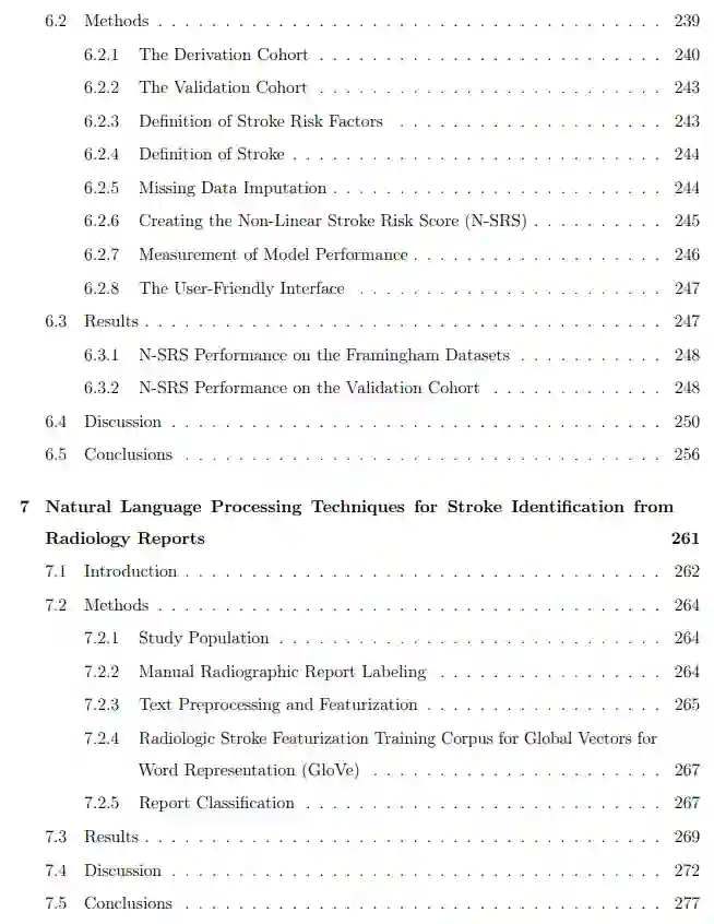 接下来,我们专注于以中风患者为中心的预测模型。我们强调模型推导和外部验证过程,并提出潜在的技术来从非线性模型中识别可操作的见解。使用来自广为人知的弗雷明汉心脏研究的结构化数据,我们在第 6 章中提出了一个健康个体估计 10 年中风风险的新模型。该模型已在波士顿医疗中心 (BMC) 进行了前瞻性验证,并且正在 Hartford HealthCare 的初级保健机构进行回顾性评估。第 7 章转向非结构化信息,介绍从非结构化放射影像文本中提取患者信息的综合框架。我们结合使用自然语言处理和监督学习方法,自动检测缺血性中风的潜在存在、位置和严重程度。该模型现已在布莱根妇女医院和 BMC 成功用于患者表征。