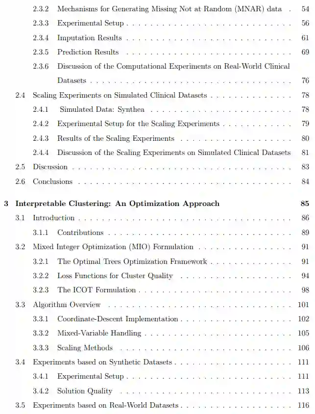 从电子健康和索赔记录到纵向研究和非结构化医疗报告,医疗保健行业使用各种需要专门算法的数据源。该领域遇到的问题的复杂性以及数据的不完整性,对充分发挥其潜力构成了重大挑战。第一部分介绍了利用优化技术解决医疗保健应用中遇到的一些最常见数据问题的新 ML 算法:缺失值、聚类和删失。在第 2 章中,我们设计了一种新方法 MedImpute,用于在多变量面板数据中估算缺失的临床协变量。在第 3 章中,我们提出了通过最优树 (ICOT) 进行可解释聚类,这是一种恢复可解释数据集群的新型无监督学习方法。在第 4 章中,我们解决了使用最优生存树 (OST) 算法进行删失的挑战,生成全局优化的生存树模型。与各种数据集和环境上的现有成熟方法相比,我们展示了这些算法的卓越计算性能。第一部分提供了可解释性不必以牺牲准确性为代价的证据,提供了一套新的工具,可以在医疗保健中采用数据驱动模型方面发挥关键作用。