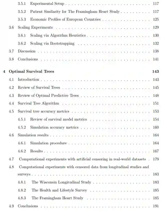 生存分析解决了数据集中出现的挑战,在这些数据集中出现了审查观察结果,其中感兴趣的结果通常是事件发生前的时间,但对于某些人来说,事件的确切时间是未知的。审查结果在医疗保健研究中无处不在,因此,用于生存分析的 ML 方法越来越受欢迎。我们提出了利用 MIO 和局部搜索技术生成全局优化生存树模型的 OST 算法。我们证明 OST 提高了现有生存树方法的准确性,特别是在大型数据集中。本章的主要贡献是: