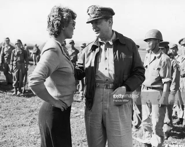 玛格丽特希金斯与麦克阿瑟交谈朝鲜的情况。对于女记者一向严格限制的马克阿瑟来说,希金斯是唯一的例外。