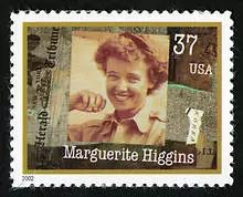 美国发行的纪念玛格丽特希金斯的邮票,背景是她效力一生的《纽约先驱论坛报》