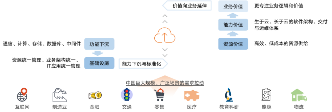 云原生定义了一条能够让应用最大程度利用云能力、发挥云价值的最佳路径,是基于云计算 PaaS 概念全新容器化思路、更贴近企业业务侧的价值延伸。价值的延伸也促使越来越多的非业务逻辑从应用程序剥离下沉到基础设施,在此进程中,中国规模化的应用场景将更好促进云原生技术的创新演进,成为云原生的最好生长土壤和试验田。