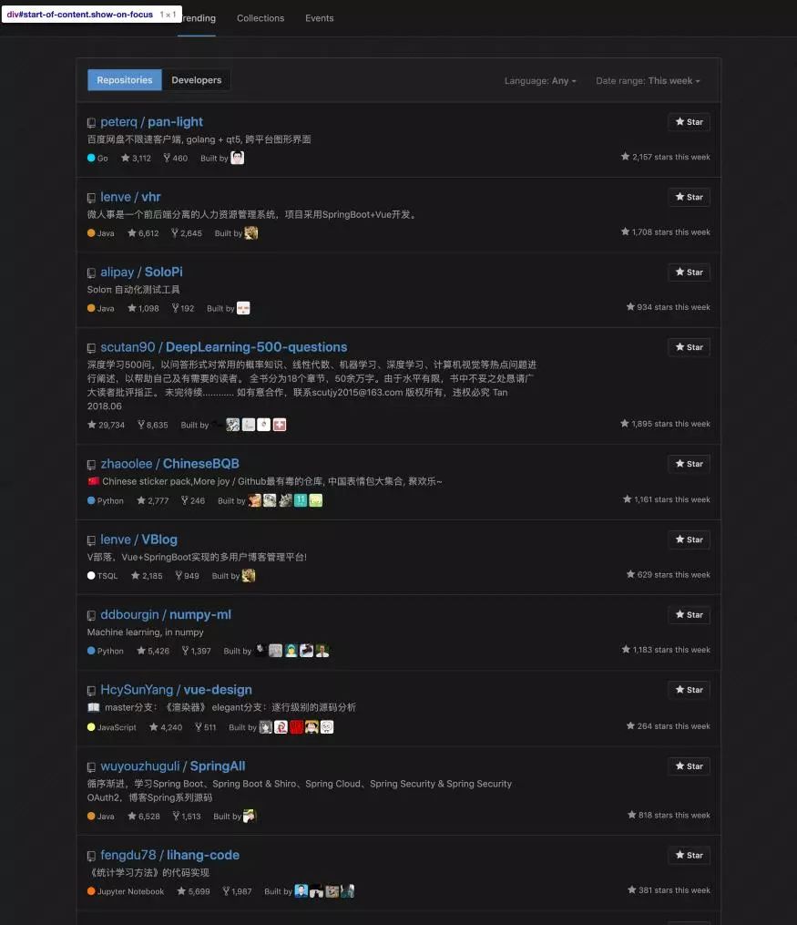 Balazs 说到,自己在任意时间打开 GitHub Trending 页面,很大概率会看到许多由中国开发者创建的 repo,甚至遇到过前 10 项目中有 9 个使用中文的情况,如下:
