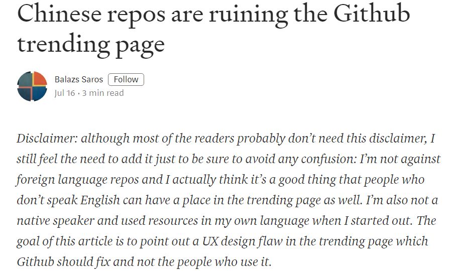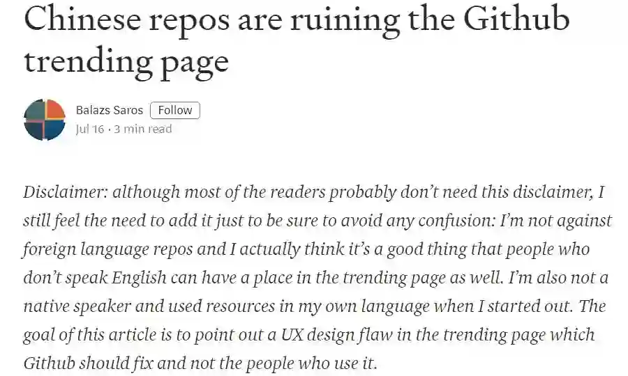 近日一名国外开发者(Balazs Saros,下简称 Balazs)在个人博客发表了一篇看似是在“声讨”中国开发者的文章,标题起得有点唬人 —— "Chinese repos are ruining the Github trending page"(中国开发者创建的 repo 正在破坏 GitHub Trending 页面)。