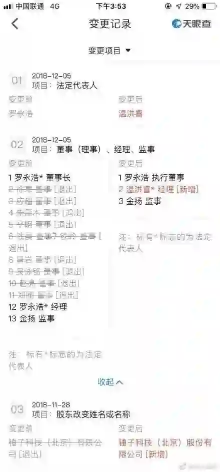 根据知名企业工商信息查询工具天眼查的爆料显示:12月5日,北京锤子数码科技有限公司在工商上做出了重大变更,该工商原法定代表人罗永浩的法人身份被温洪喜取代,朱萧木、钱晨、徐航、唐岩等名字也从董事会移除。