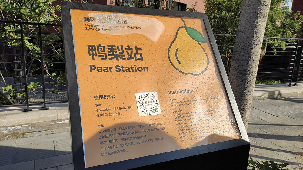 有一个可爱的名字,比如「鸭梨站」、「柚子站」,标示着美团无人配送站,还有一个小程序码。