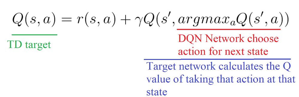 解决方案是:当我们计算Q目标时,我们使用两个网络将动作选择与目标Q值生成分离: