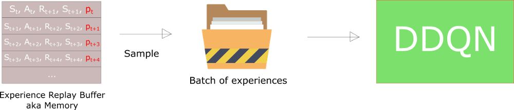 但是,这里仍有问题。请记住,通过正常的体验重放,使用随机更新规则。因此,对体验进行抽样的方式必须与它们的原始分布相匹配。