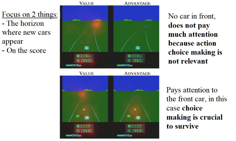 我们看到这种价值流Value network streams(V(s))是关注路面(橙色模糊),但更关注的是最前方地平线处是否有汽车出现。同时,该网络也注重得分。