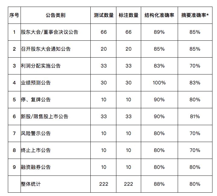 对结构化提取测试主要观察提取的实体是否准确并全面,摘要的准确率则与公告制作小组制作的人工摘要通过edit-distance方法直接对比,摘要的实现力求与官方要求一致。