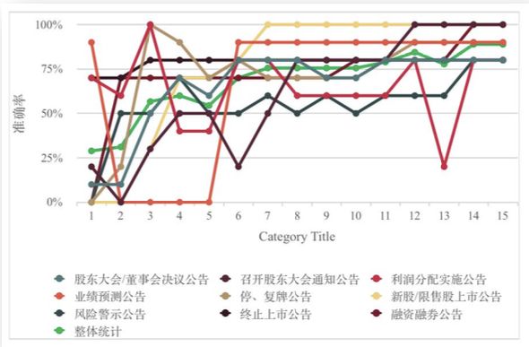 在模型开发过程中,公告种类和数量循序增加,本课题期间,系统经过了15个版本的迭代。前4、5个版本准确率的提升非常明显,通过深度学习结合统计的方式,准确率快速提升到75%的区域。伴随着测试数据多样性的增加,在6版本到14版本迭代的过程中,准确率出现了波动,通过对异常情况进行分析,提升统计学习的泛化能力,同时对异常情况进行规则整理,最终准确率获得了提升。