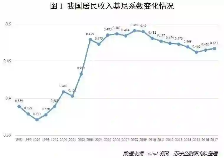 Wind数据显示,我国居民收入的基尼系数自2000年首次超过警戒线0.4以来,总体呈现出先攀升后稳定的态势。但值得注意的是,2003年至今,基尼系数从未低于0.46,而最近三年,更是逐年增大,由2015年的0.462升至2017年的0.467(参见图1)。