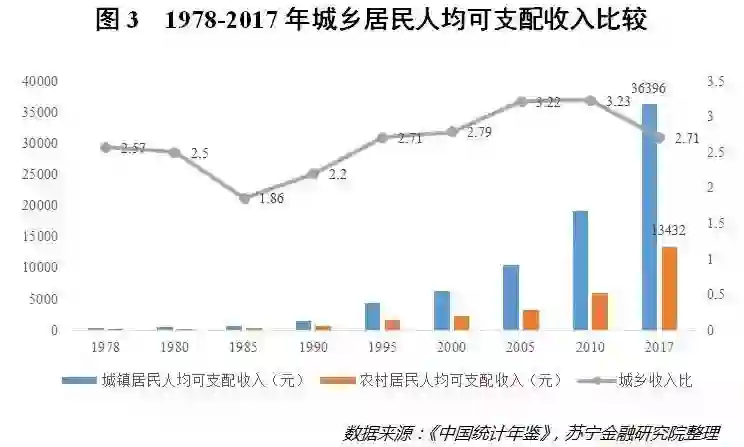 不过,从城乡居民收入比来看,在经历了长期的攀升后,近些年开始有下降的趋势,2017年为2.71,这比2010年的3.23低了不少。这说明城乡居民收入的绝对差值虽然在增大,但相对差值却有所缓和。