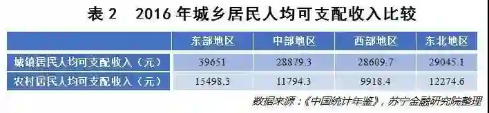 从东、中、西部及东北地区的城乡居民收入水平比较来看,东部地区的居民收入水平大幅度高于中西部和东北地区。2016年的数据显示,从城镇居民人均可支配收入层面看,东部地区是西部地区的1.39倍;从农村居民人均可支配收入层面看,东部地区是西部地区的1.56倍。倘若对比东部城镇居民与西部农村居民的人均可支配收入,那么差距无疑是更大的,前者是后者的将近4倍(参见表2)。