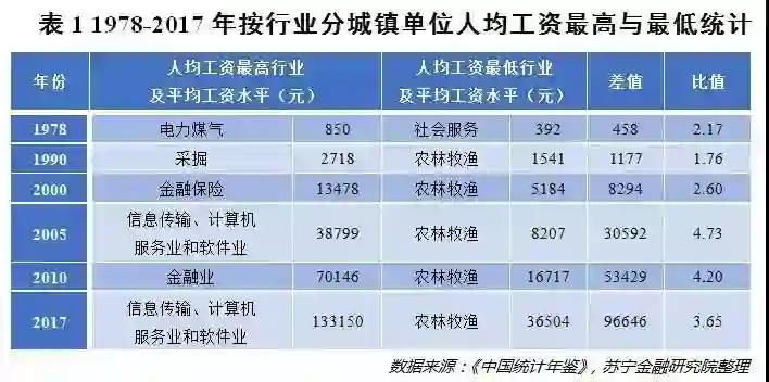 从工资差距看,1978年人均工资最高的电力煤气业与人均工资最低的社会服务业的工资差距仅为458元。然而,随着时间的推移,人均工资水平最高与最低行业的差距越拉越大。到了2017年,人均工资水平最高的信息计算机软件业,比人均工资水平最低的农林牧渔业多出96646元,这意味着一个拿着平均薪资的金融从业者,一年可以比一个农民多赚近10万元,而且这种差距还有继续加大的趋势。